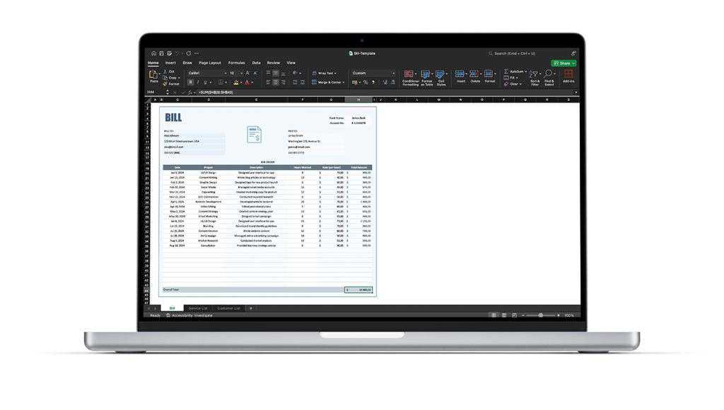 A clean, easy-to-use billing template for tracking invoices and payments. Perfect for freelancers and small businesses who need a simple way to record transactions and stay organized.