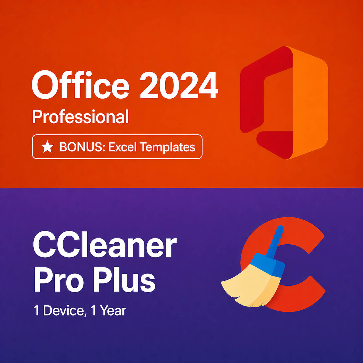 - Two products in one bundle: Office 2024 Professional + CCleaner Professional.