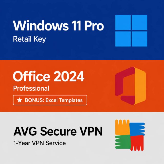 Bundle: Windows 11 Pro + Office 2024 Professional + Excel Templates + AVG Secure VPN